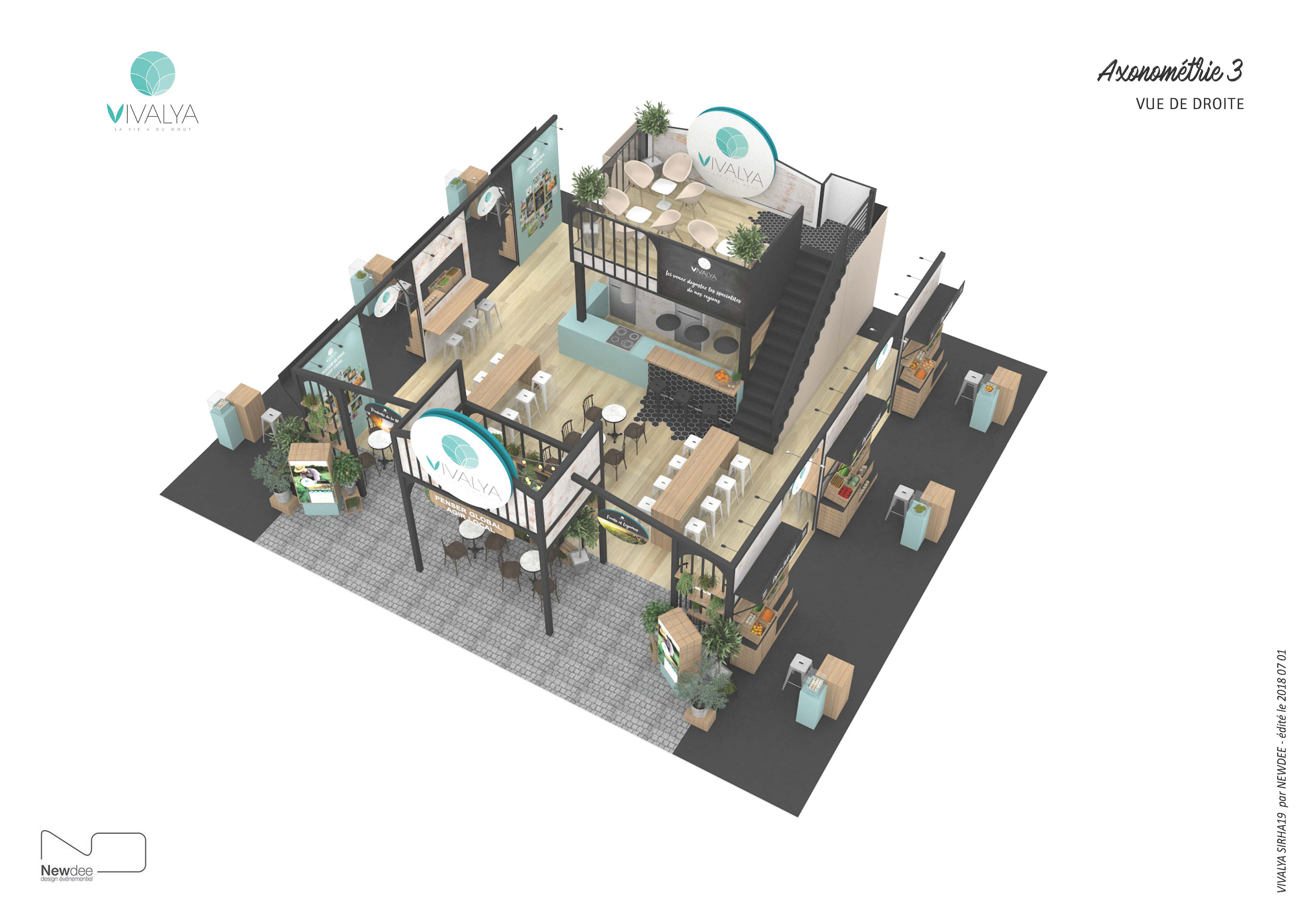 J'ai imaginé les "HALLES VIVALYA" où exprimer toute la diversité des entreprises adhérentes de ce réseau de distribution de produits frais dans la convivialité. Le design du stand alliant Tradition et Modernité à l'image de cette coopérative jeune génération. + DESIGN + Projet non retenu