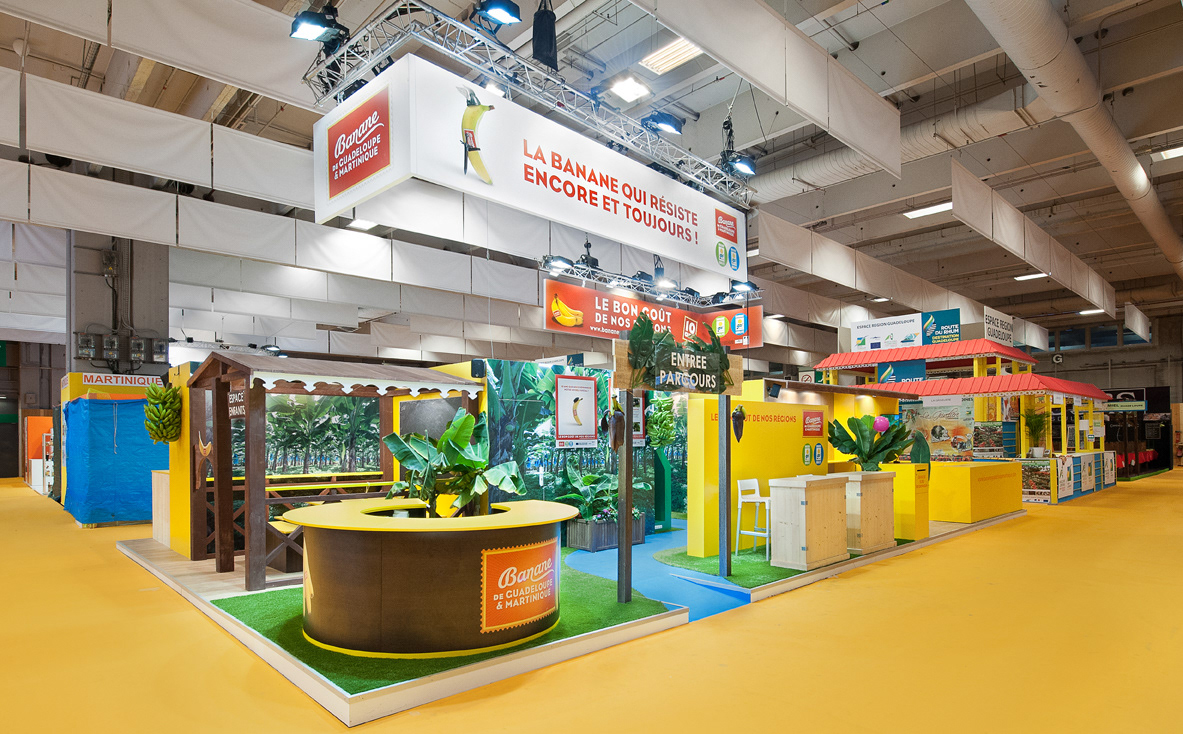 Réalisé à l'occasion du Salon de l'Agriculture 2014, ce stand pour la Banane de Guadeloupe se devait de promouvoir cette marque haute en couleurs. Le visiteur était invité à suivre le parcours d'une rivière au cœur de la bananeraie et à en découvrir les mystères [faune, flore, producteurs, engagement dans la production durable]. Ce stand coloré, frais et chaleureux était enrichi de nombreuses animations et dégustations pour aller à la rencontres des gens qui font de la Banane de Guadeloupe un produit si particulier. + DESIGN ET PLANS DE FABRICATION + [ Projet réalisé au sein de la société GALIS ]